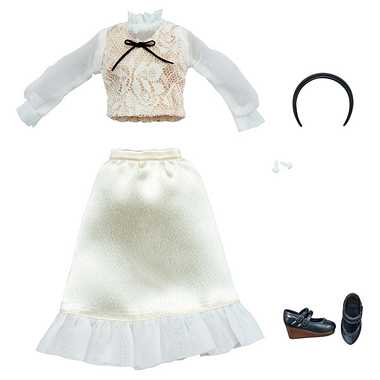 Romantic ruffles and lace are unified in white tones and accented with black accents for a grown-up dolly LICCA. Her hair is a mix of dark brown and gold, and her lips are a mature matte color. It comes with a black headband and kutsu.