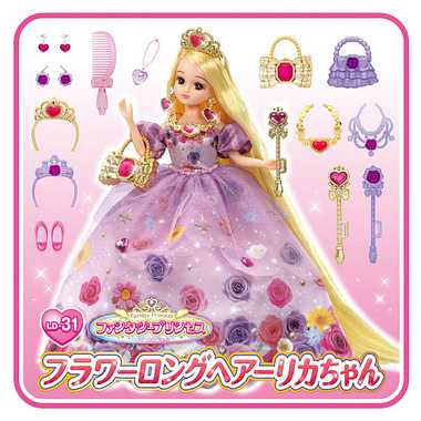 LICCA has long blonde hair that reaches down to her feet. She wears a dress with flowers printed all over the skirt, and comes with a comb to make it easy to play with her hair. She comes with two sets of accessories, a heart motif and a rose motif.