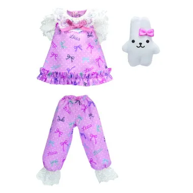 This dress set features pajamas with a cute ribbon pattern with white fluffy lace and a cute rabbit plush toys with a ribbon.