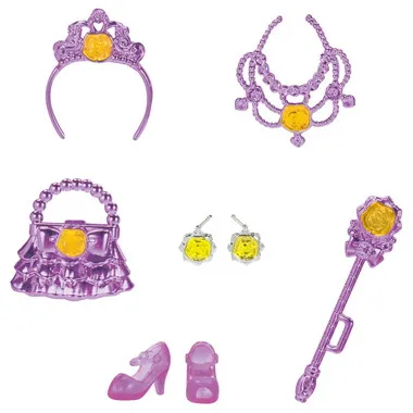 In addition to a rose-motif tiara, walking stick, necklace, earrings, and bag, a set of shoes is also included.