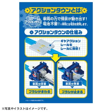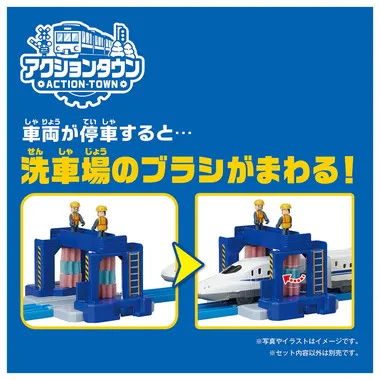 The scene comes to life with the power of the vehicles! Introducing the Guru Guru Car Wash from Action Town! When a vehicle arrives, the car wash brushes turn automatically! The included gear action rail is half the size of a straight rail, making it easy to assemble a layout! Create your own moving town!